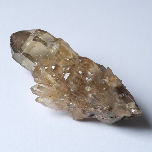 コンゴ民主共和国産 クンダリーニクォーツ(非加熱シトリン)の原石 花束のような形の 豊かさあふれる素晴らしいクンダリーニクォーツです。 一番大きな結晶には虹もあります。 クンダリーニクォーツはコンゴでしか産出されない天然のシトリンです。 クンダリーニとは、第一チャクラ(一番下のチャクラ)で、とぐろを巻いた蛇のように眠っているエネルギーのことです。 クンダリーニが覚醒するとすべてのチャクラが活性化するといわれています。 前へ進む力が必要な時、生命力を押し上げるサポートにもおすすめです。 ◇ 取扱いの注意:長時間の直射日光はお避けください ◇ サイズ:4.2×3.6×長さ9.2cm ◇ 重量:102g ◇送料と発送方法について:当店では、石のサイズや壊れやすさを考慮し、安全にお届けするために最適なヤマト運輸の配送方法(ネコポス・宅急便コンパクト・宅急便)を当方にて選定しております。 配送料は一律660円(¥13,000以上のご注文で国内送料無料)とさせていただいております。 ◇ 発送について:ご入金日より1~7日ほどお時間いただきます。 ◇ 同梱について:ご購入後の同梱、送料おまとめをご希望の方は、ご連絡くださいませ。一度キャンセル処理をして、おまとめ専用カートをお作りしますので、再度ご購入手続きをお願いいたします。また、梱包済みのものに関しましては、同梱出来かねます。ご了承ください。 ◇ 返品について イメージの違いによる返品、交換は出来ません。サイズ、傷、欠け、汚れなどをよくご確認の上ご購入いただければと思います。 自然が作り出すものなので、傷や欠けなどあるものもございますが、それもこの石にとって完全な状態であることを理解していただけたら幸いです。 なお、検品、梱包、配送には細心の注意を払っておりますが、万が一破損して届いた場合、注文内容と間違った内容で届いた場合には返品交換の対応をさせていただきます。その際、大変恐れ入りますが、到着より3日以内にご連絡、商品到着から7日以内にご発送くださるようお願いいたします。 ◇ 配送日時指定について ご指定の日時がございましたら注文時の備考欄にご記入ください。可能な限り対応させていただきます。