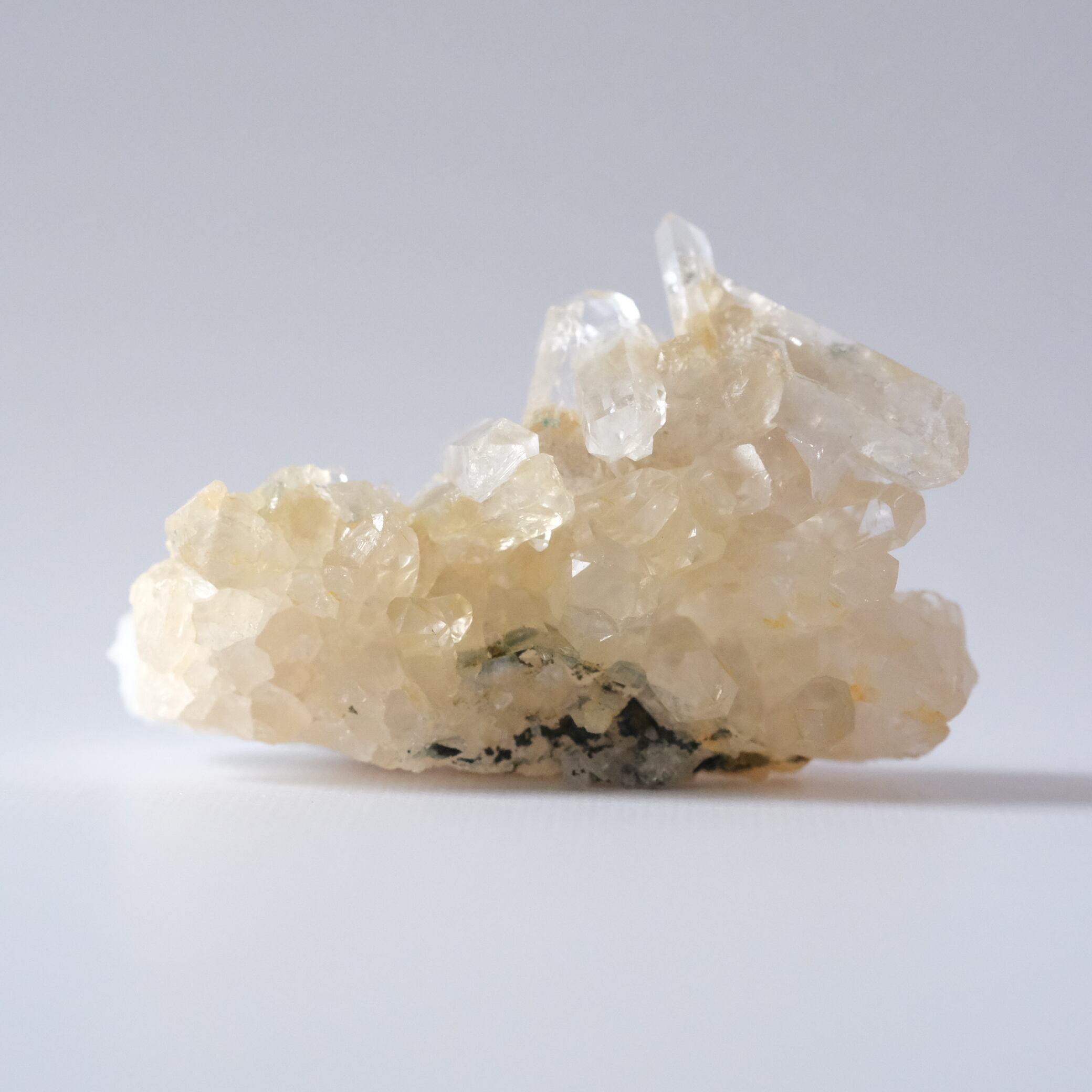 鉄酸化物などによる淡い黄金色~ブラウンの内包物や表面の付着物の色味から