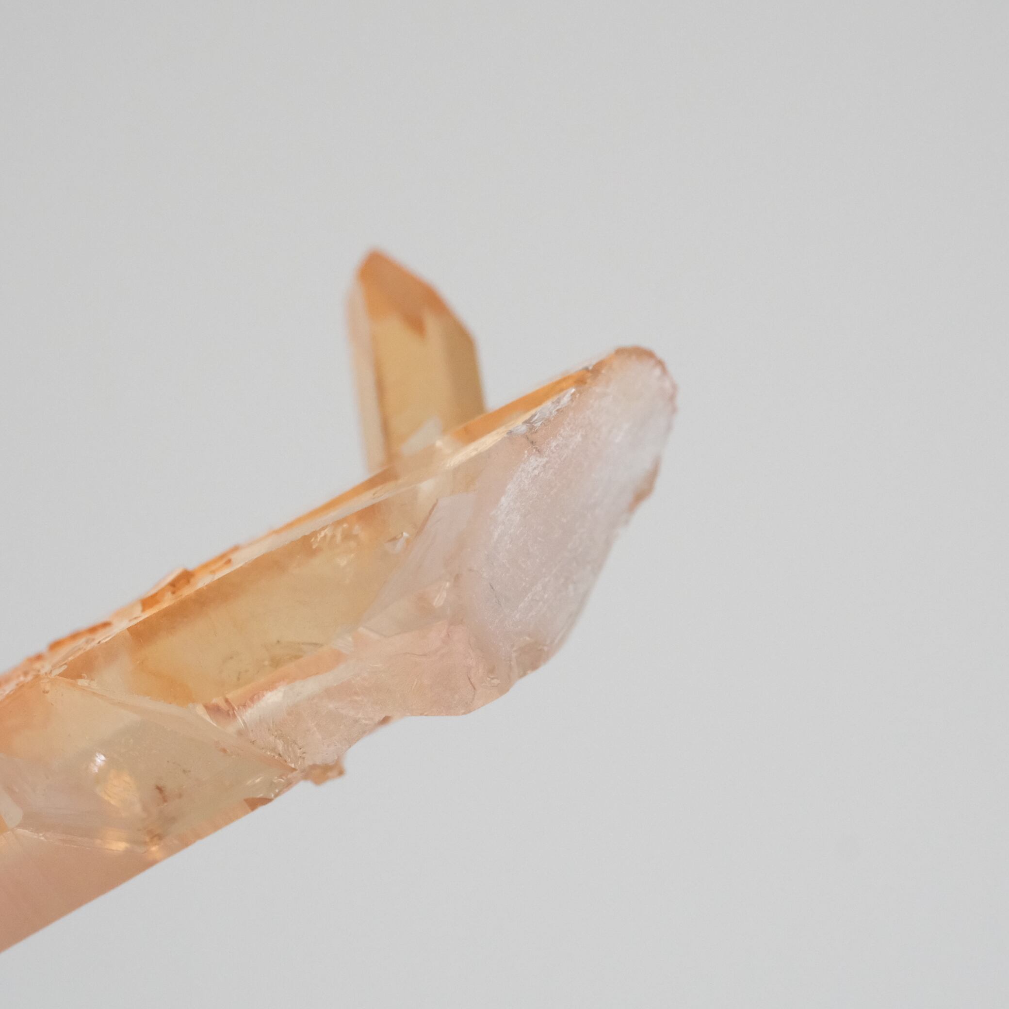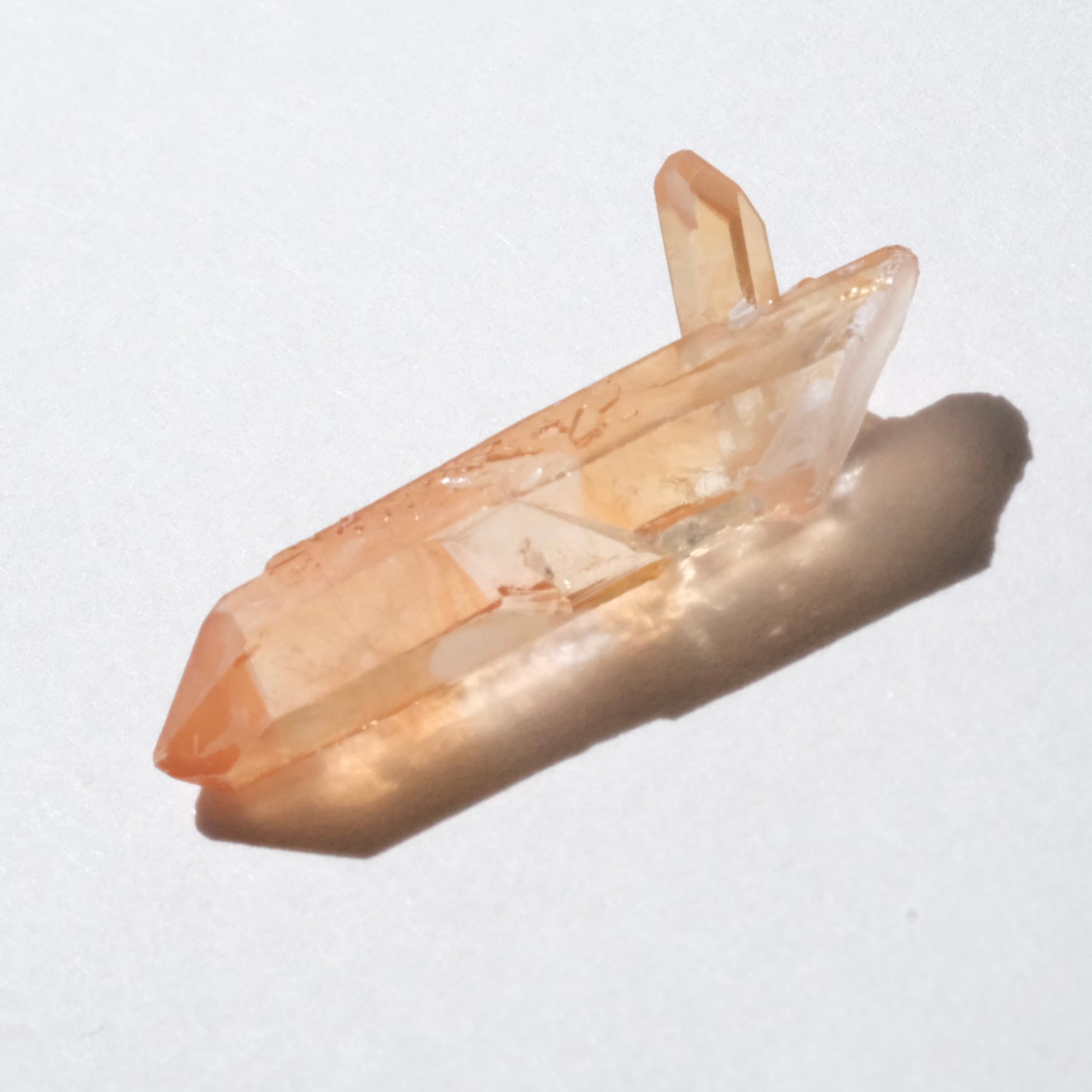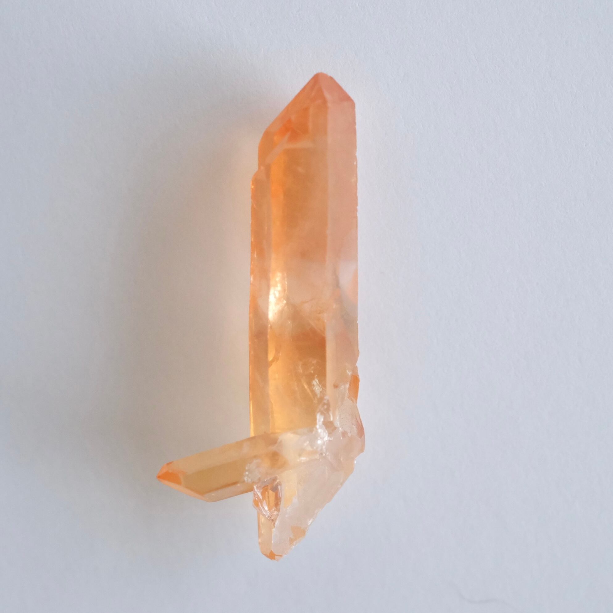タンジェリンクォーツは、クリアクォーツの表面にヘマタイトが付着し、その鉄分が長い時間をかけて溶け込み、温かみのあるオレンジ色になった水晶のことです。