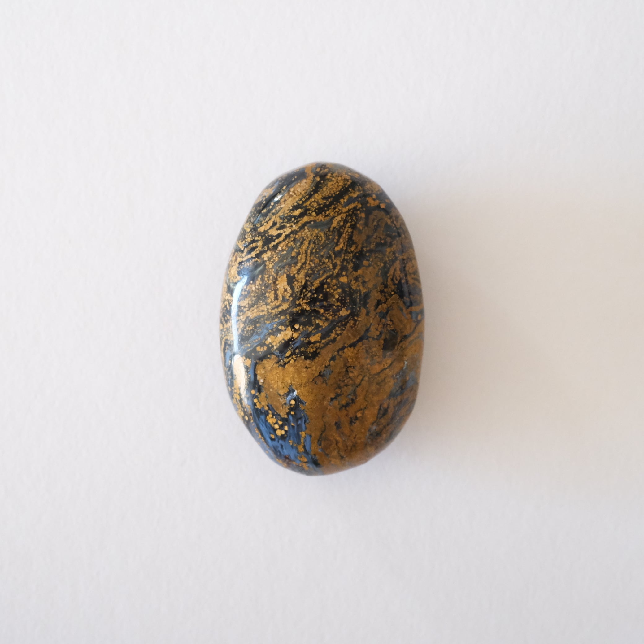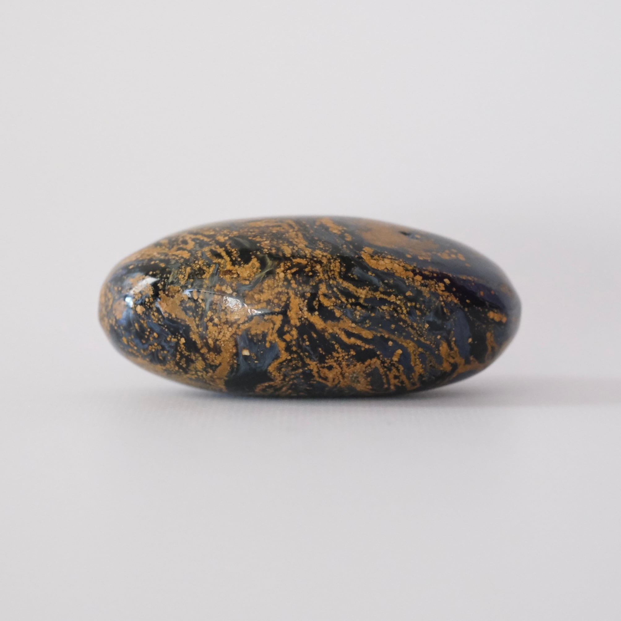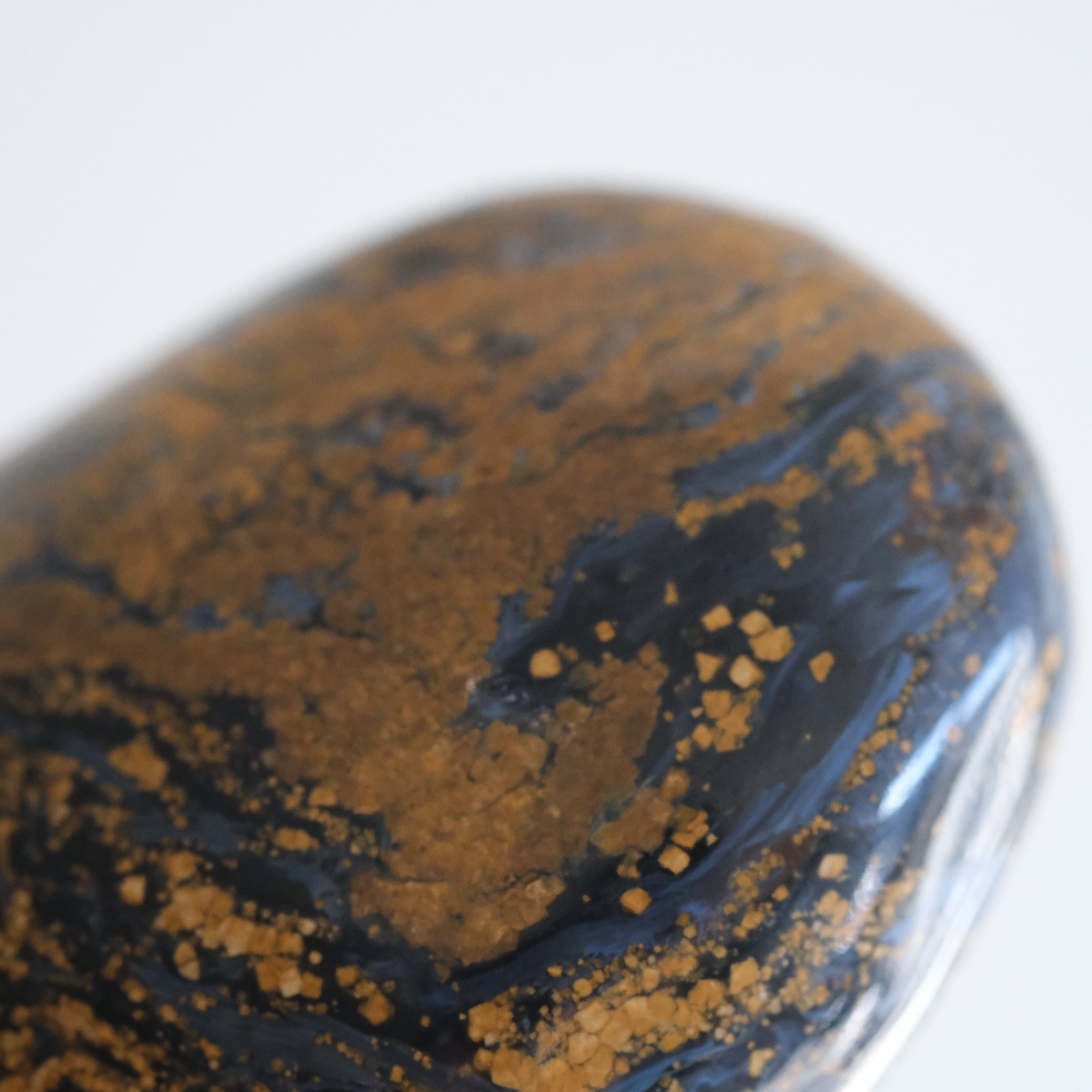 角度によってメタリック調に見える深いブルーに、黄土色の流れるような模様が広がっています。
