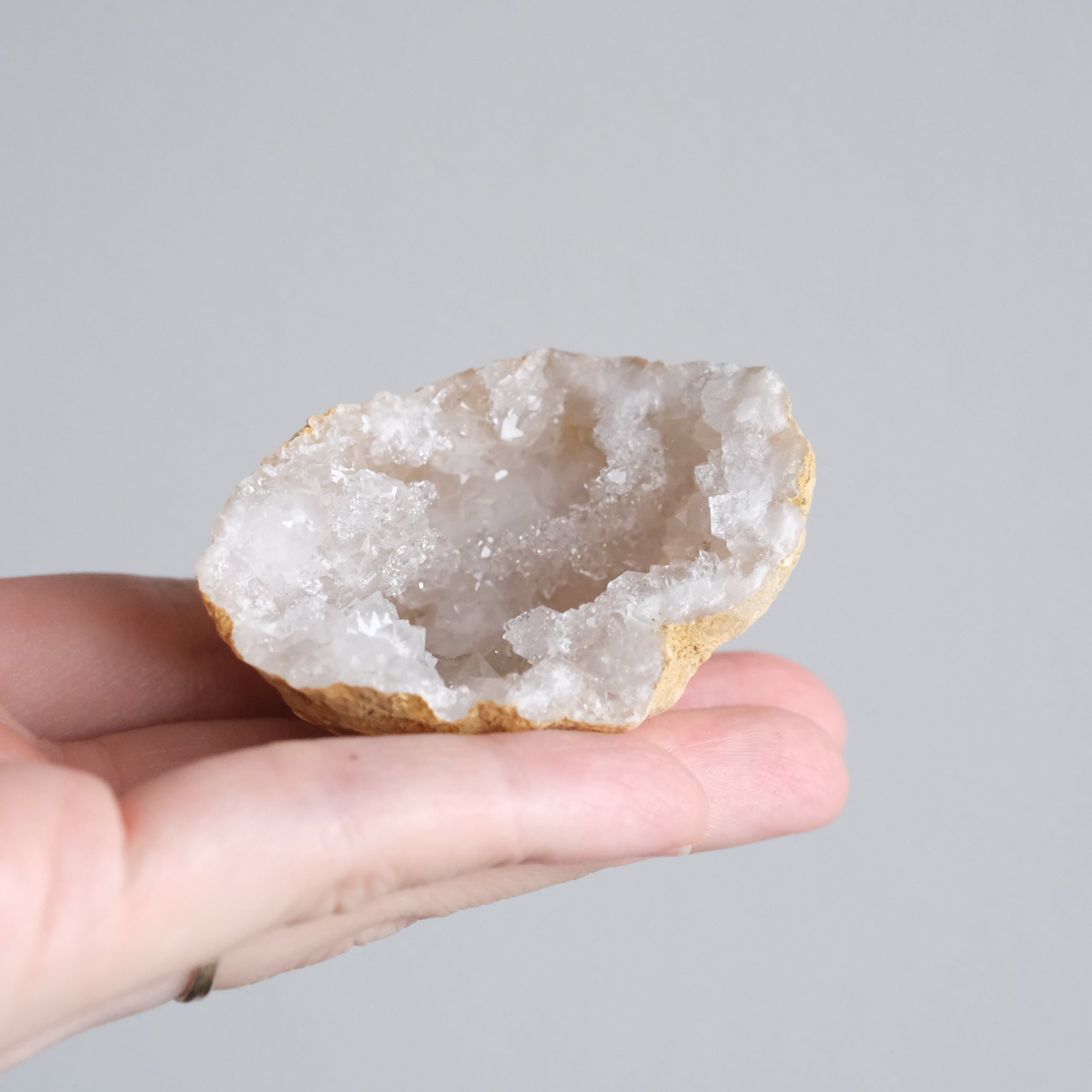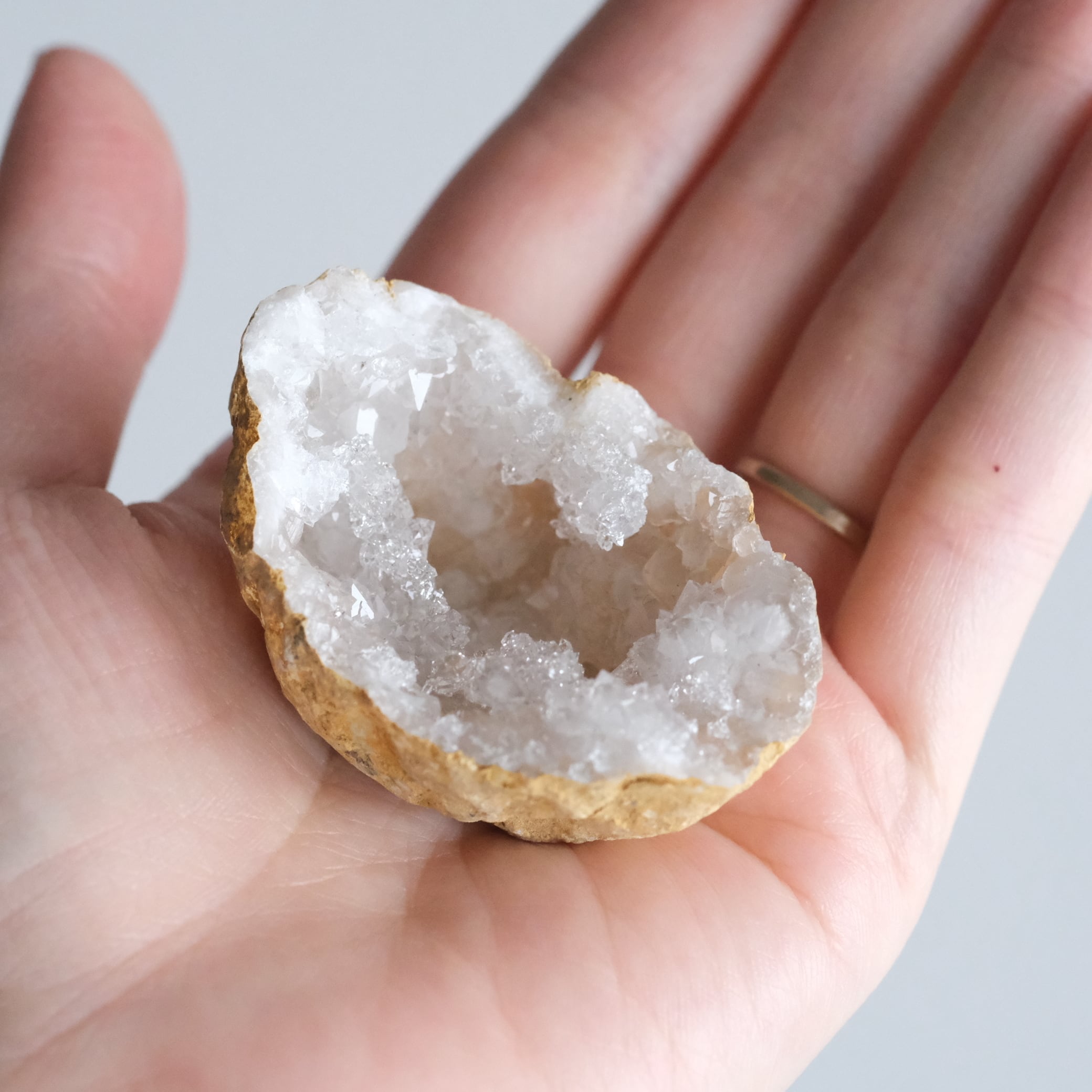内側には細かな水晶結晶がびっしりと広がる「晶洞(ジオード)」タイプの原石です。